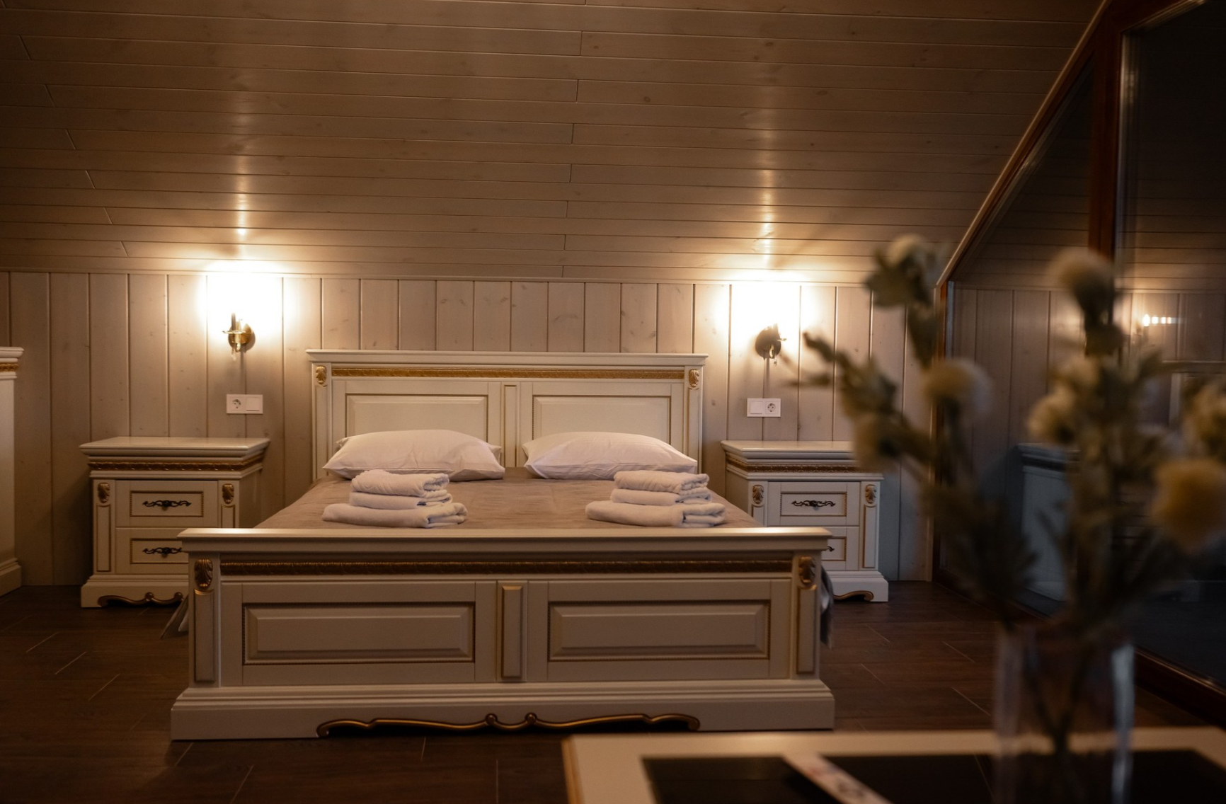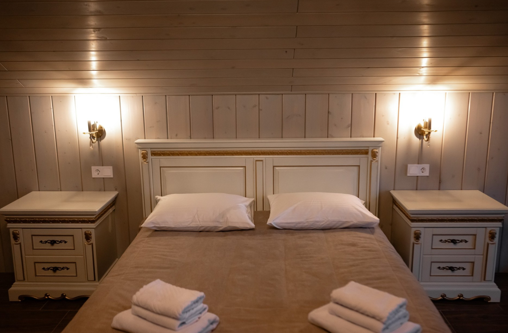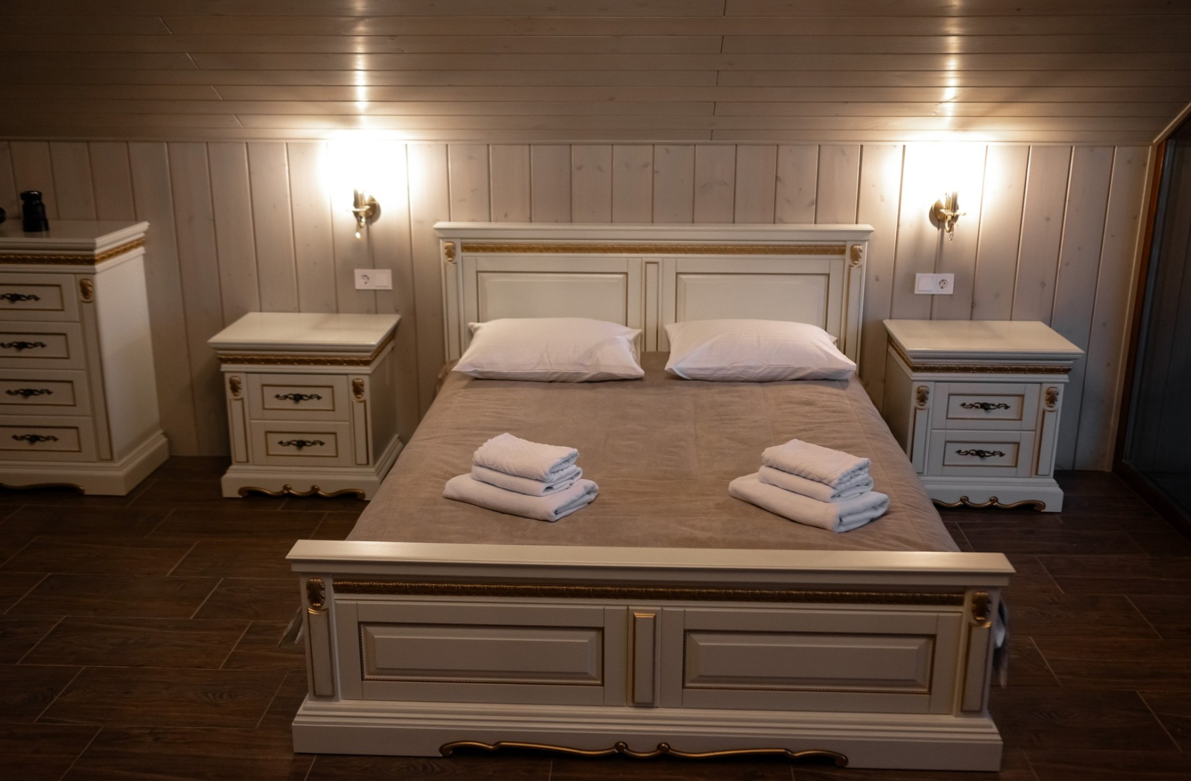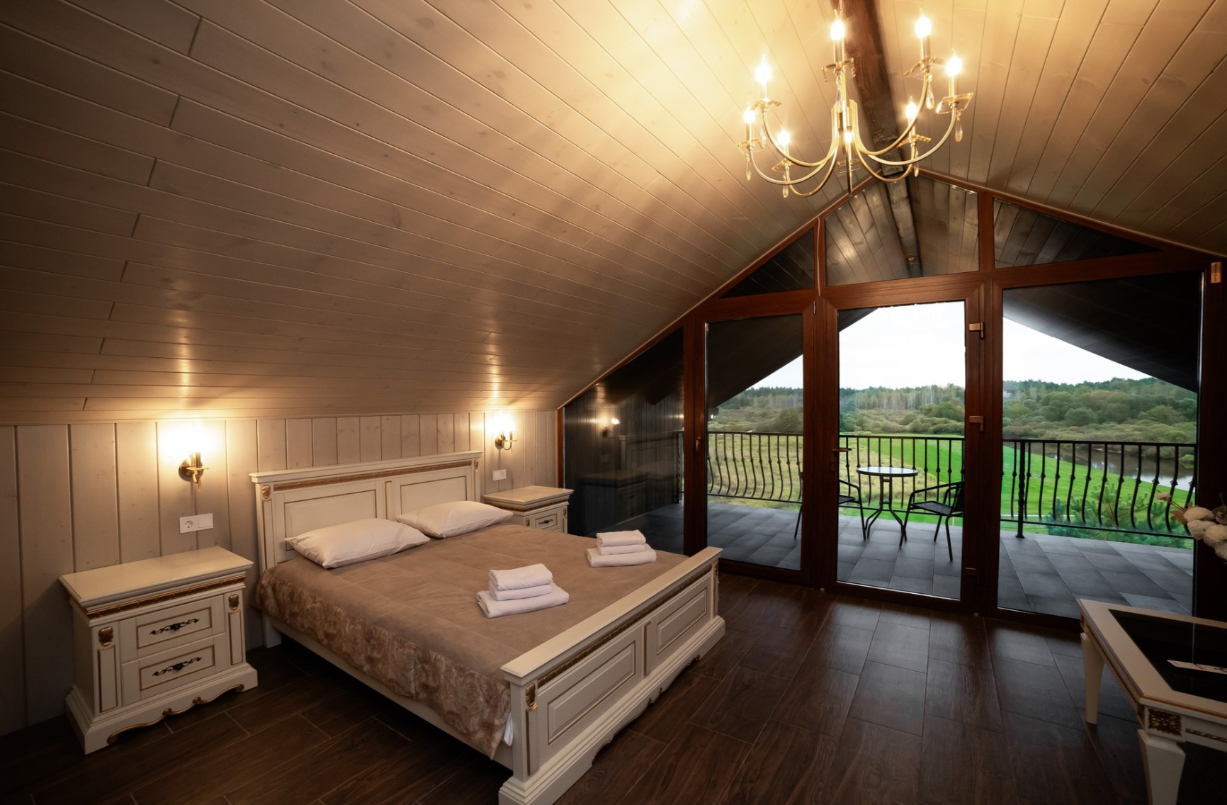 Двухкомнатный люкс высокой комфортности готовы к приёму самых взыскательных гостей. Отделаны экологически чистыми материалами , мебелью из дуба. Их отличает элегантный авторский дизайн. Панорамные окна и отдельный выход на лоджию, свидом на речку! В лобби вы получаете свободный доступ к кухне с полным набором кухонной техники , посуды и приборов! Площадь номера 40м2.