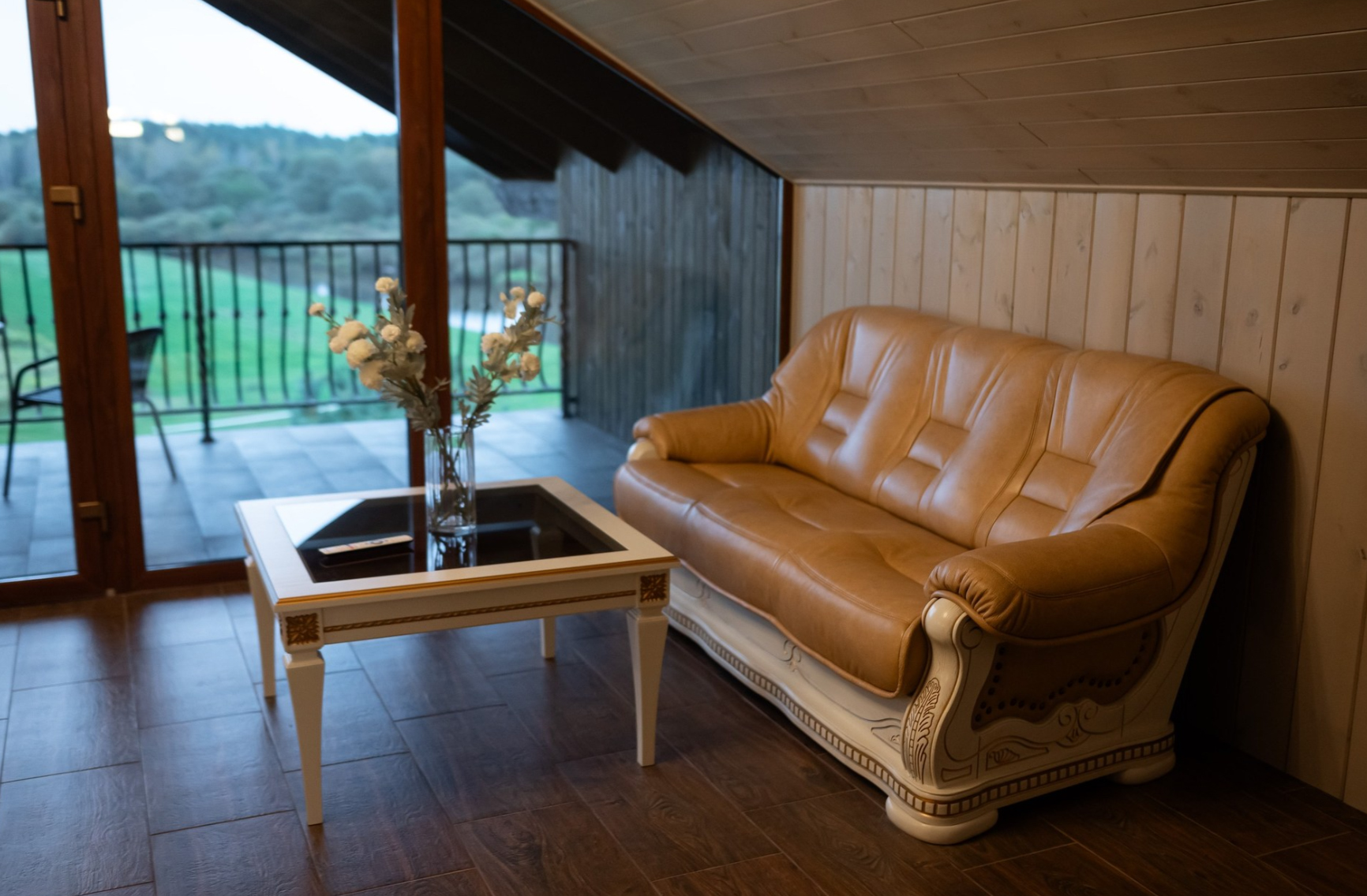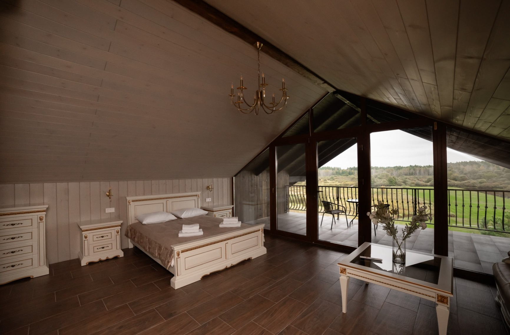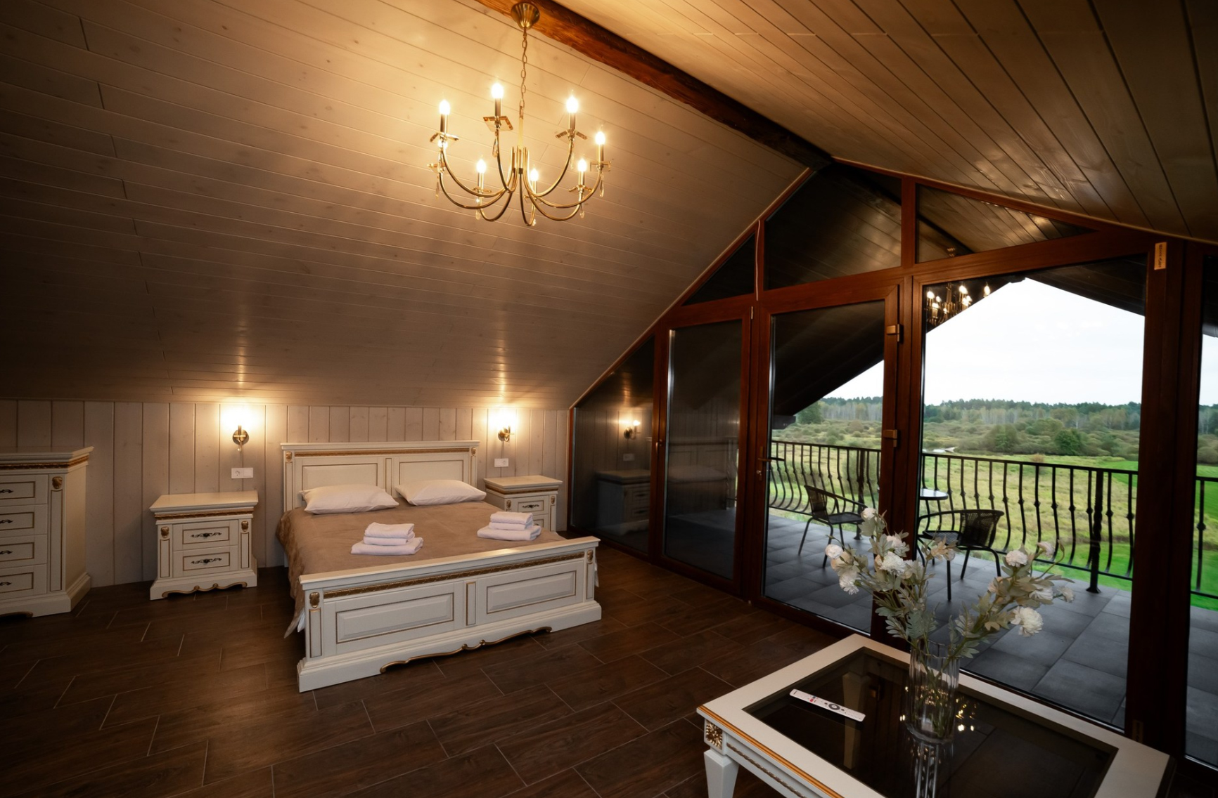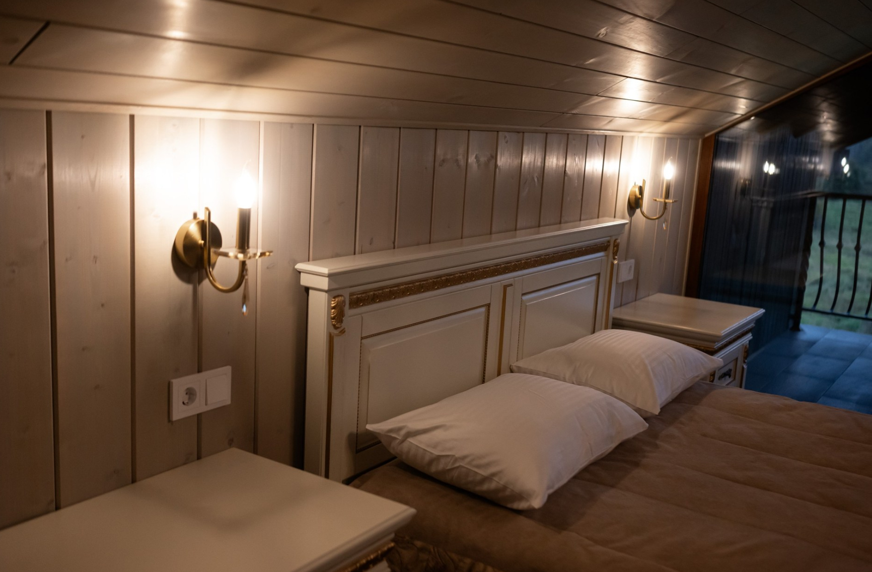 Двухкомнатный люкс высокой комфортности готовы к приёму самых взыскательных гостей. Отделаны экологически чистыми материалами , мебелью из дуба. Их отличает элегантный авторский дизайн. Панорамные окна и отдельный выход на лоджию, свидом на речку! В лобби вы получаете свободный доступ к кухне с полным набором кухонной техники , посуды и приборов! Площадь номера 40м2.