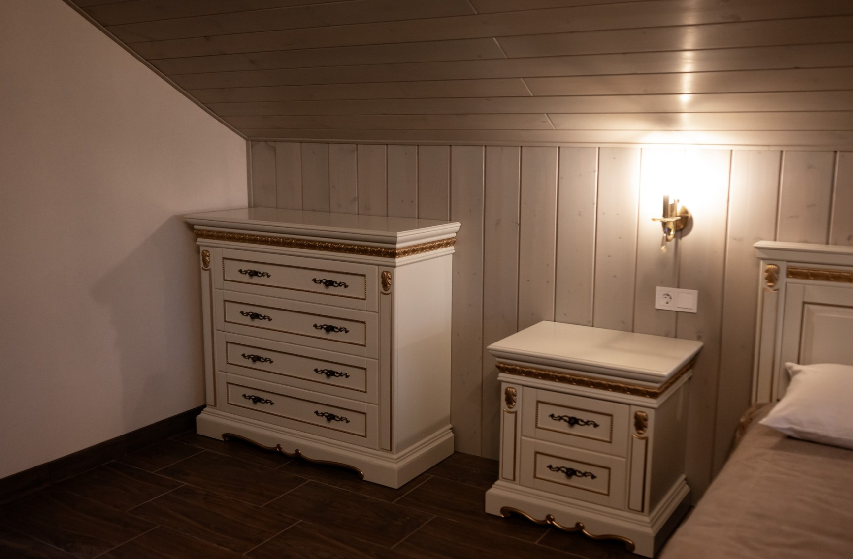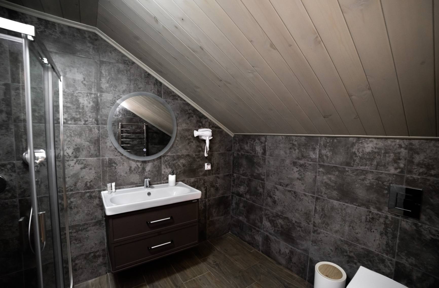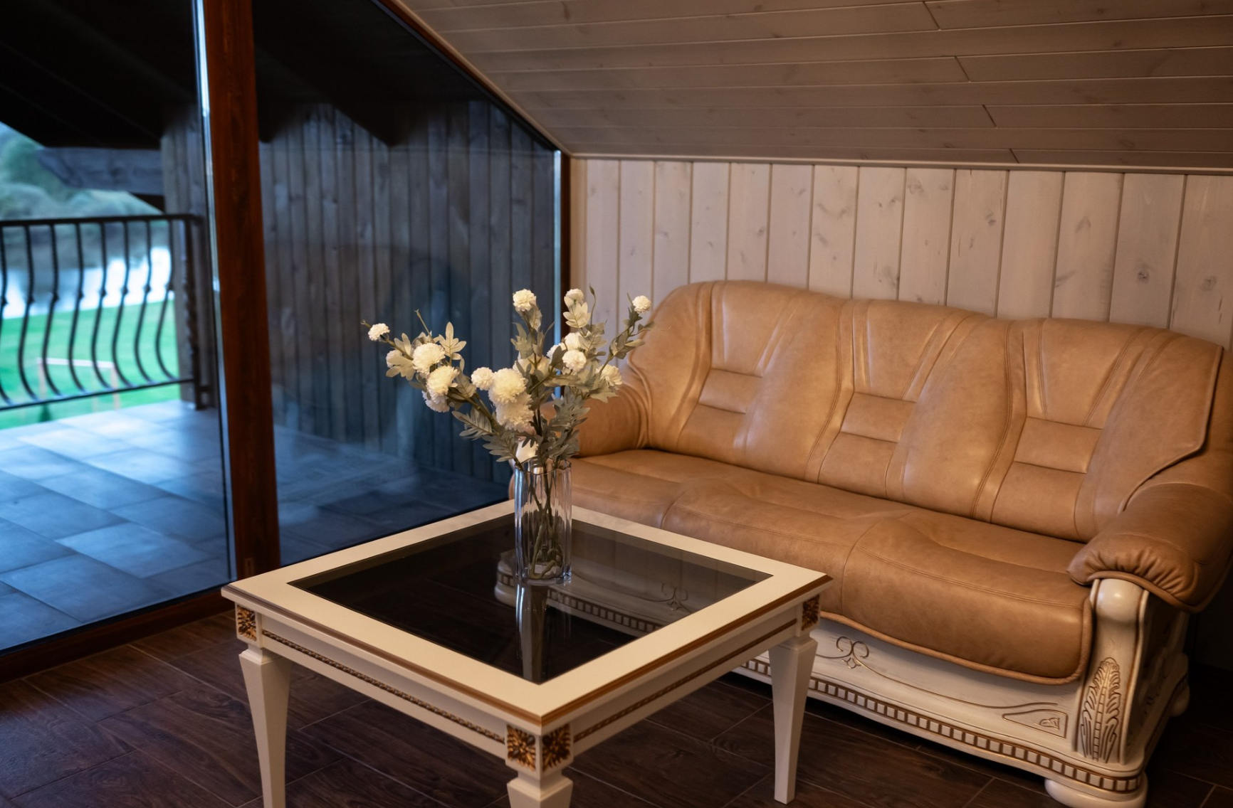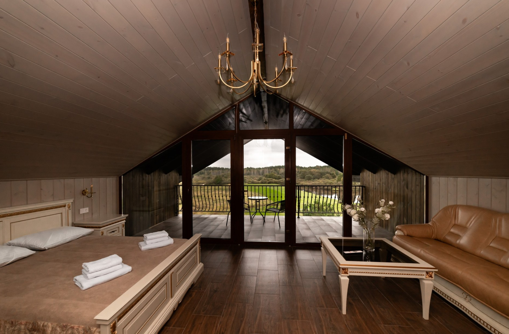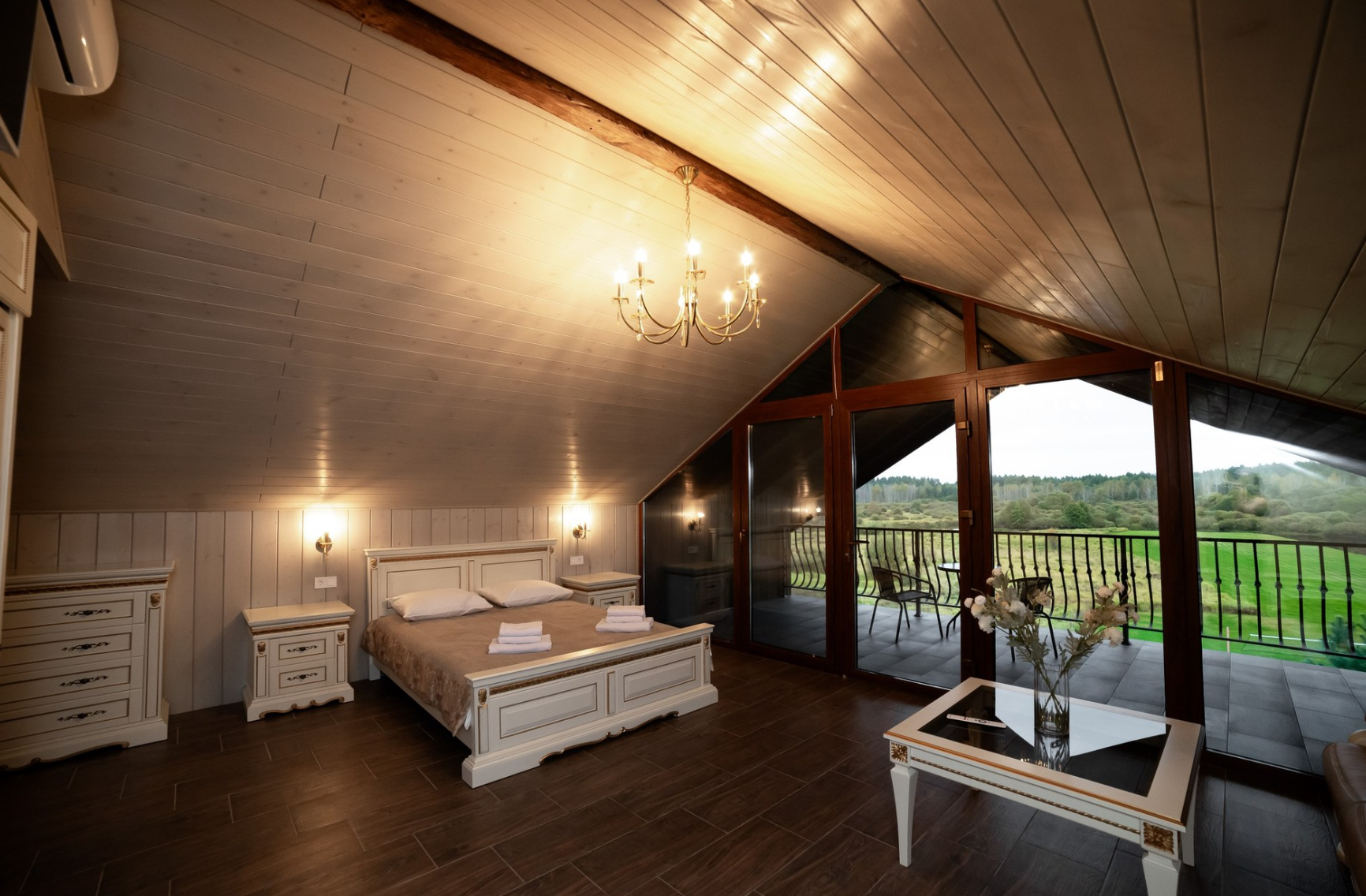Двухкомнатный люкс высокой комфортности готовы к приёму самых взыскательных гостей. Отделаны экологически чистыми материалами , мебелью из дуба. Их отличает элегантный авторский дизайн. Панорамные окна и отдельный выход на лоджию, свидом на речку! В лобби вы получаете свободный доступ к кухне с полным набором кухонной техники , посуды и приборов! Площадь номера 40м2.