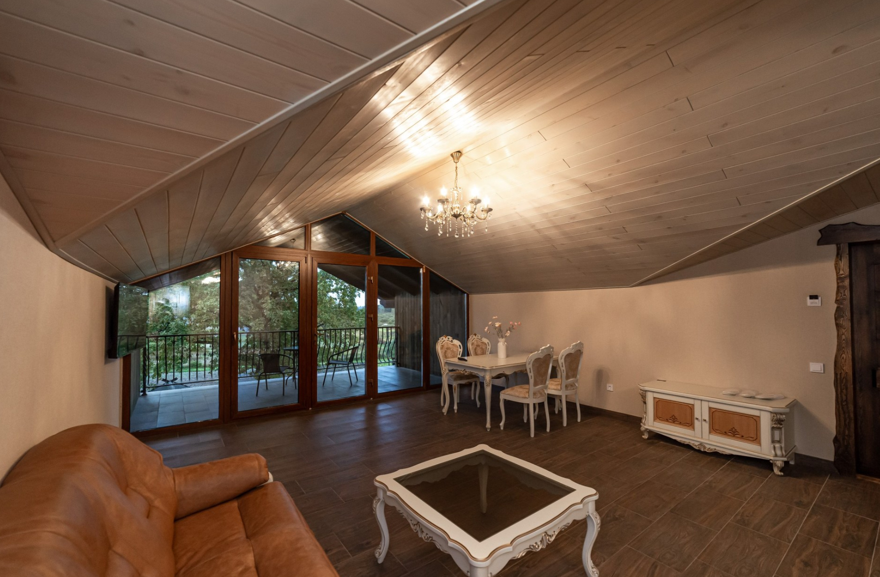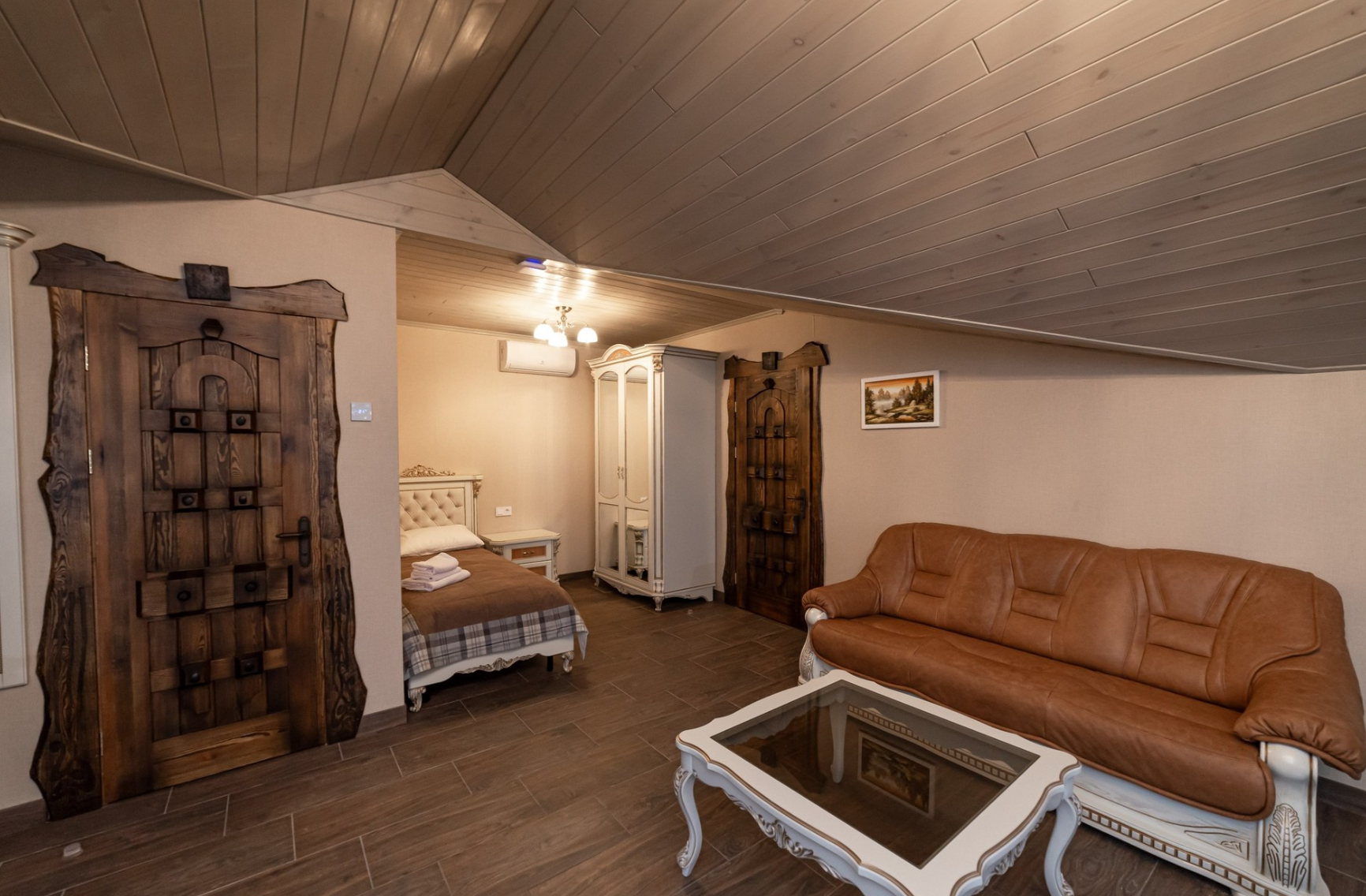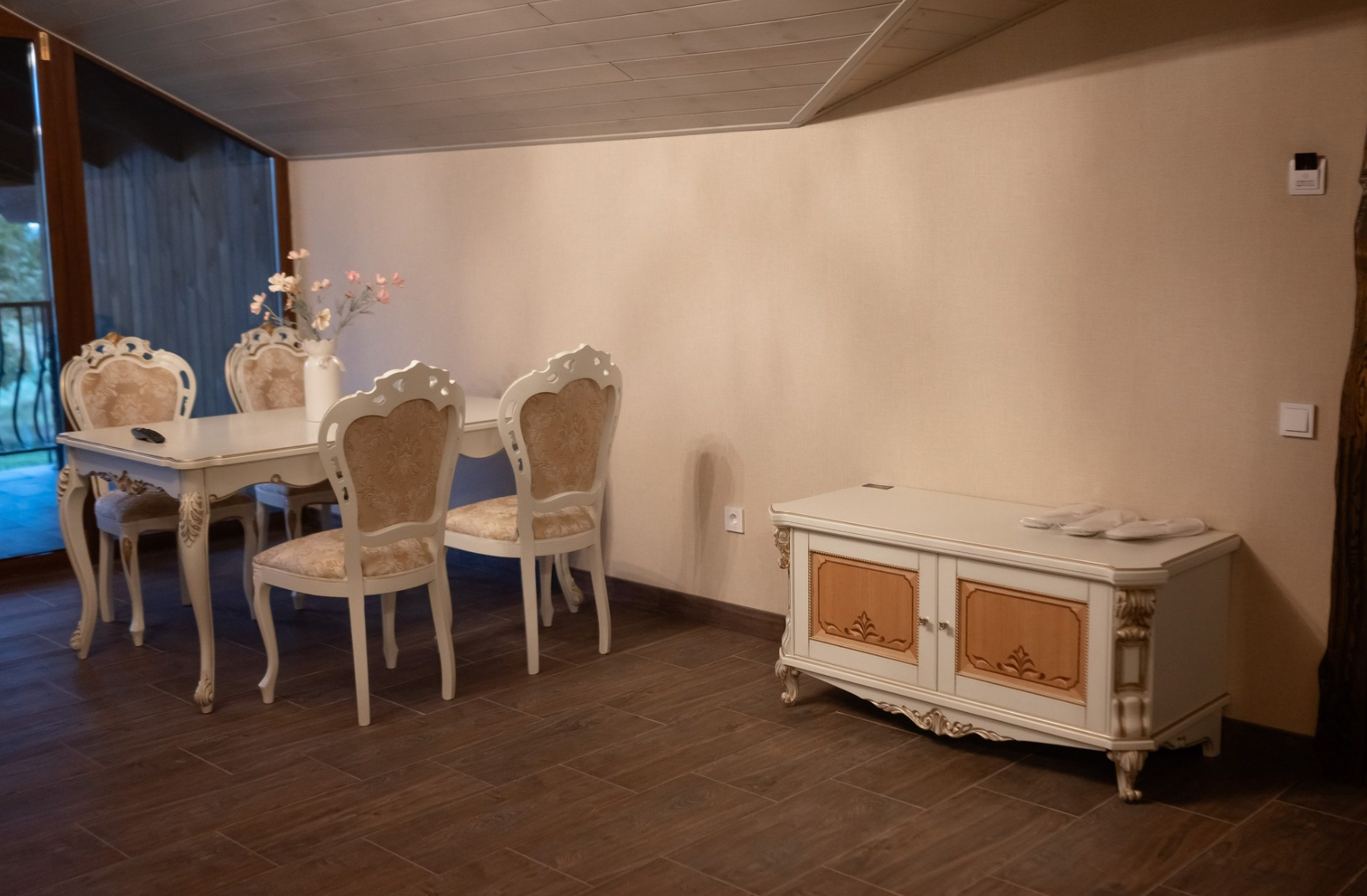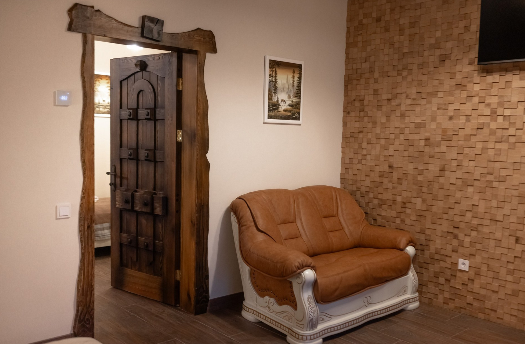 Двухкомнатный люкс высокой комфортности готовы к приёму самых взыскательных гостей. Отделаны экологически чистыми материалами , мебелью из дуба. Их отличает элегантный авторский дизайн. Панорамные окна и отдельный выход на лоджию, свидом на речку! В лобби вы получаете свободный доступ к кухне с полным набором кухонной техники , посуды и приборов! Площадь номера 73м2.