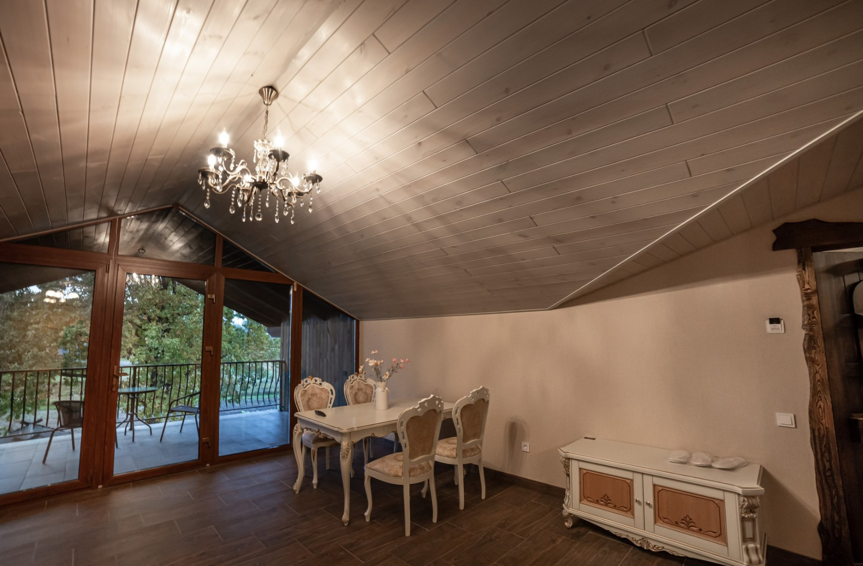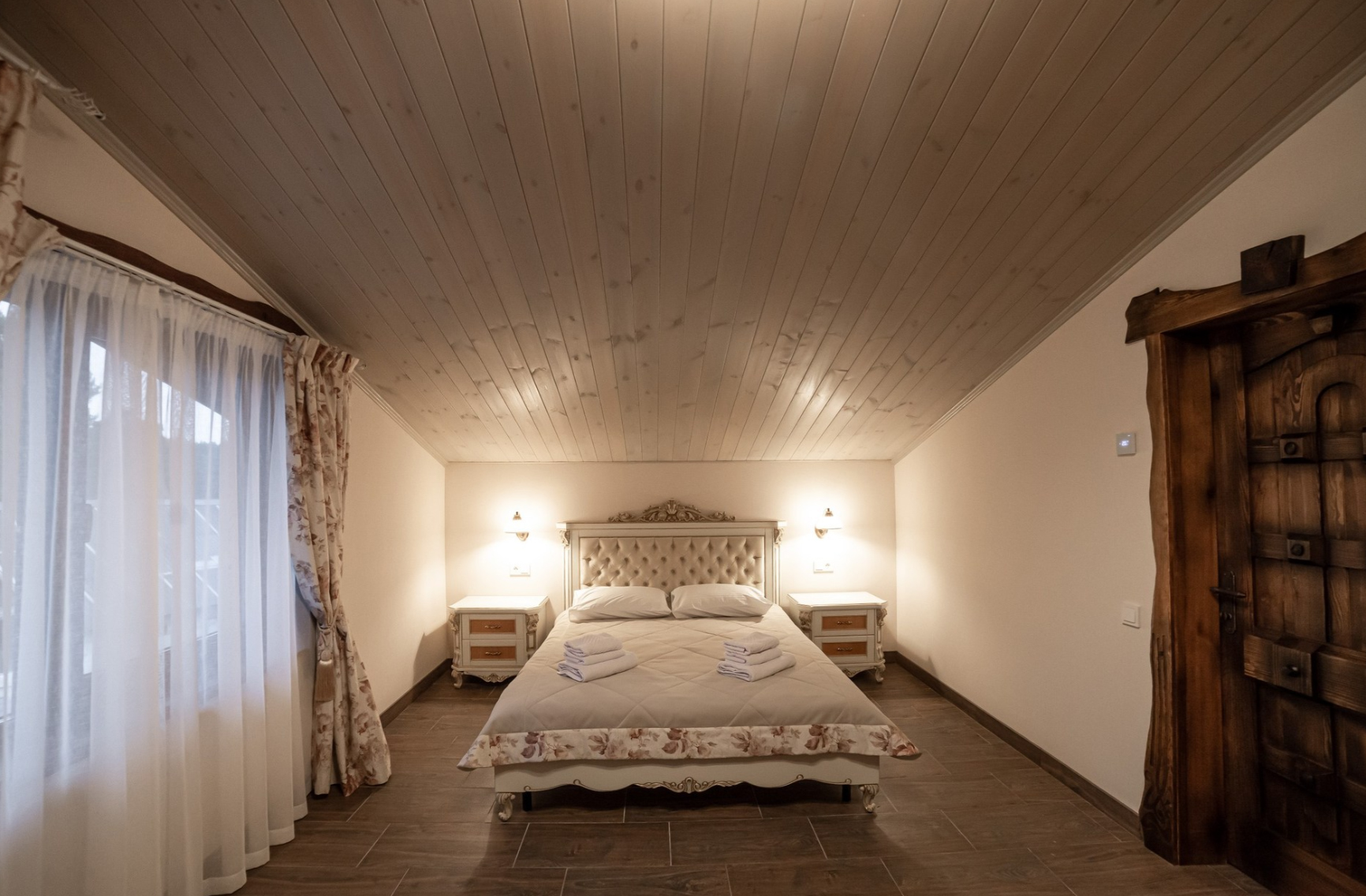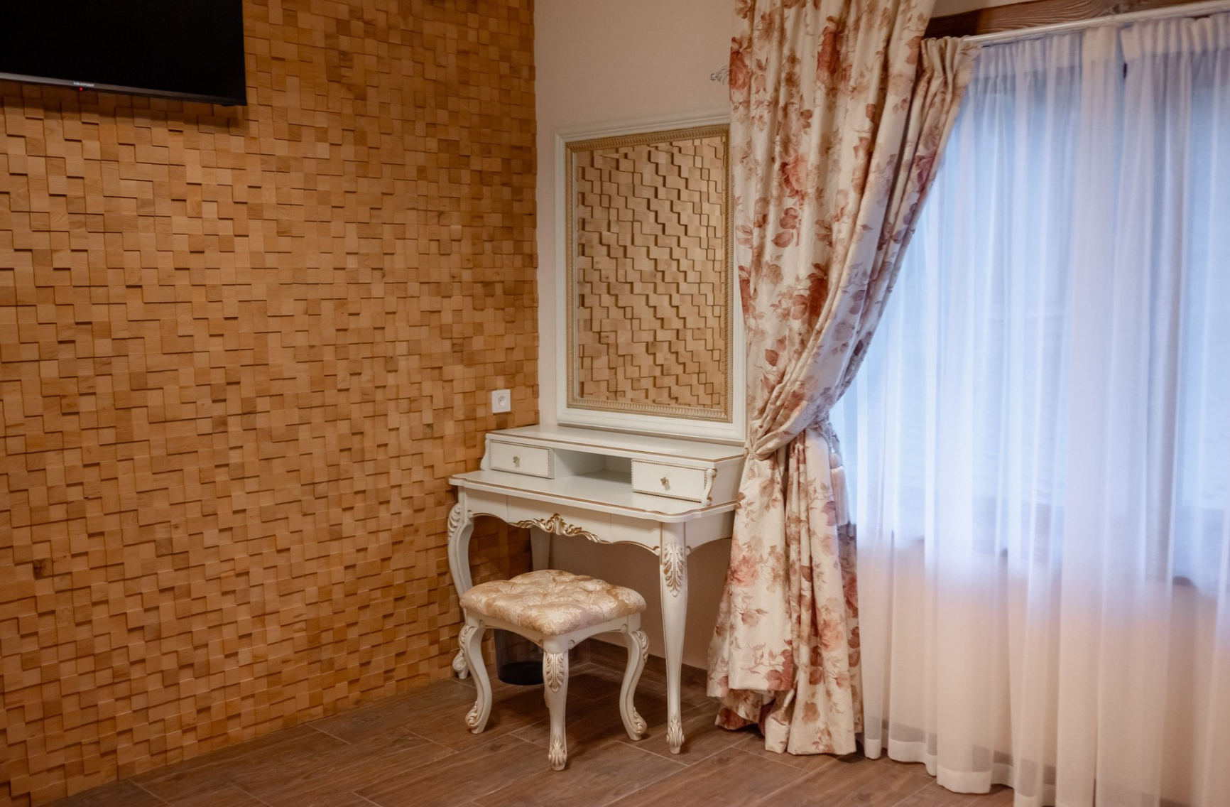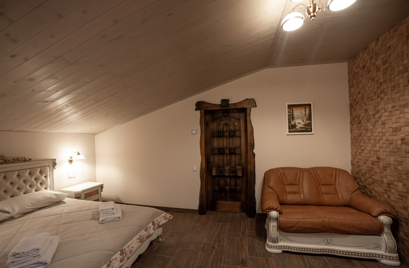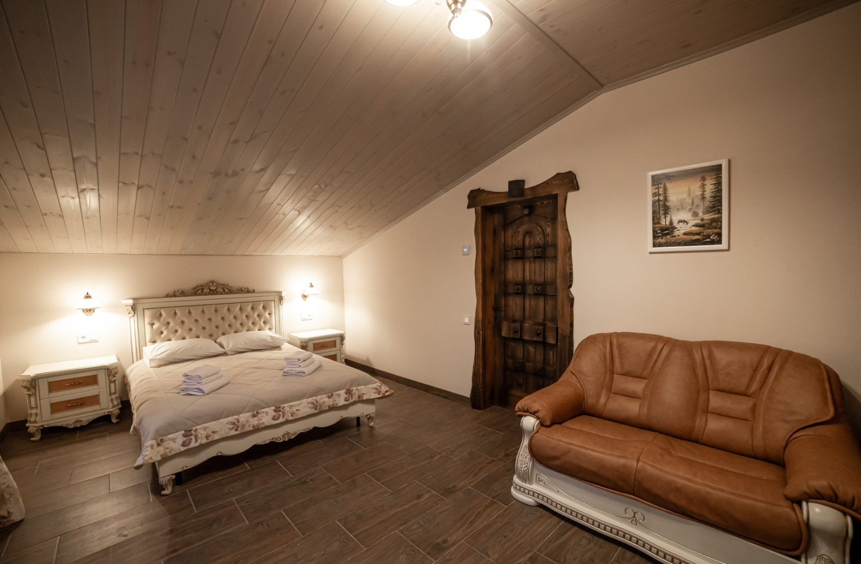 Двухкомнатный люкс высокой комфортности готовы к приёму самых взыскательных гостей. Отделаны экологически чистыми материалами , мебелью из дуба. Их отличает элегантный авторский дизайн. Панорамные окна и отдельный выход на лоджию, свидом на речку! В лобби вы получаете свободный доступ к кухне с полным набором кухонной техники , посуды и приборов! Площадь номера 73м2.
